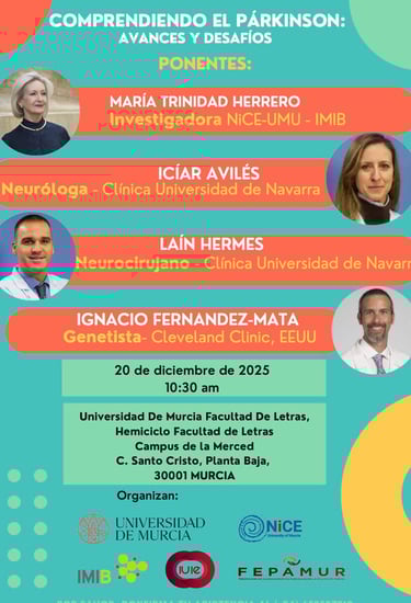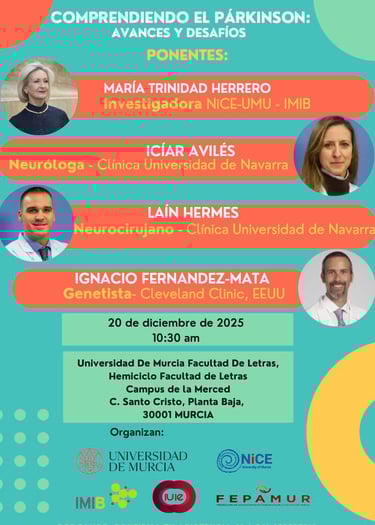 Gracias a los ponentes por compartir conocimiento y experiencia en la charla “Comprendiendo el Párkinson: avances y desafíos”: María Trinidad Herrero, Icíar Avilés, Laín Hermes e Ignacio Fernández-Mata. Sus aportaciones han enriquecido el debate y acercado la investigación y la práctica clínica a todas las personas asistentes.